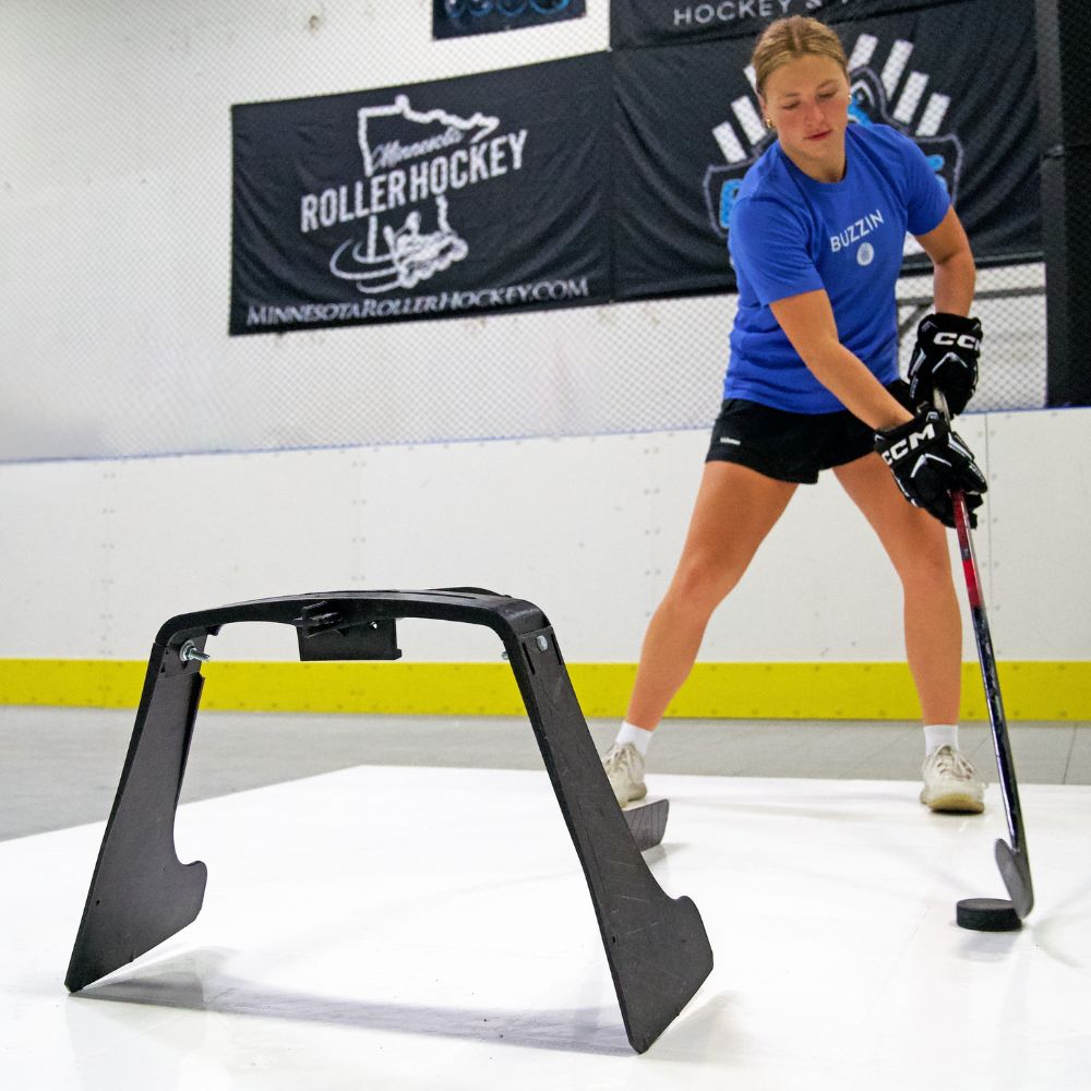 All of the above! Practice slipping under the stick, shooting under the legs, or saucing over the blade, among many more. Let your creativity run wild as you have fun with this versatile training tool.