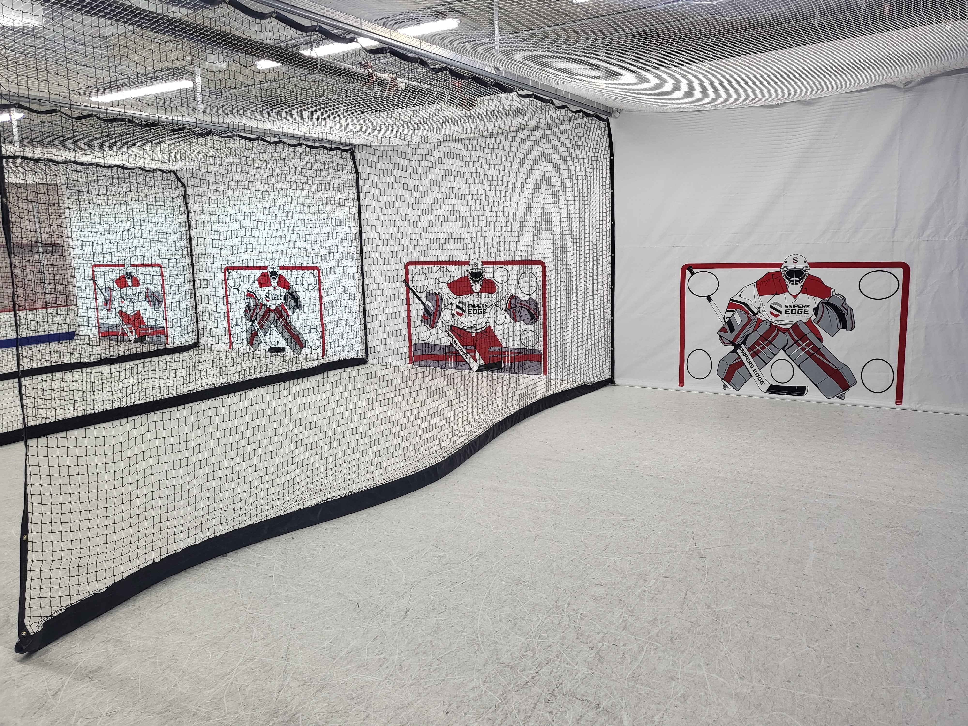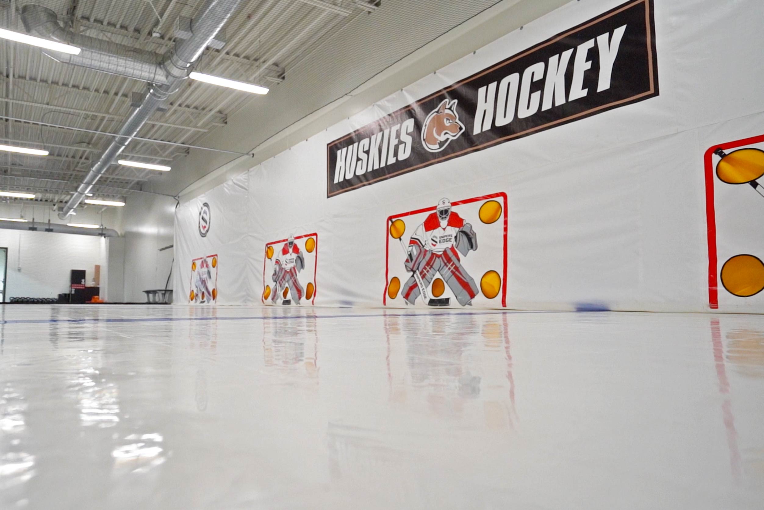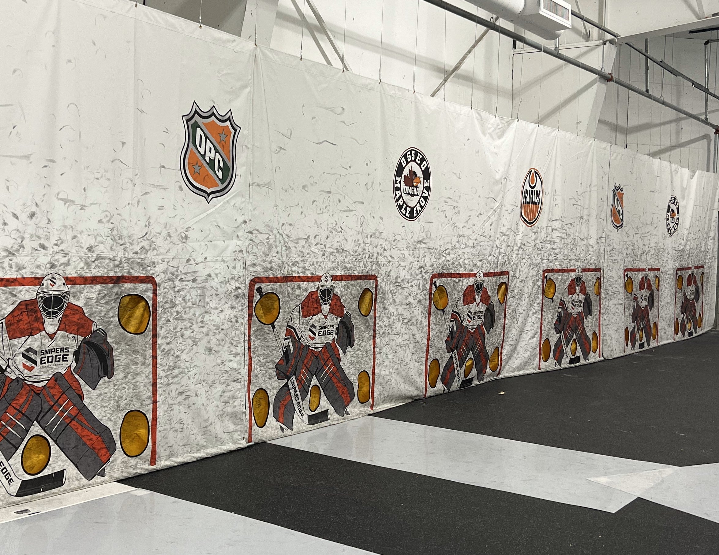 Sniper's Edge Hockey has partnered with hockey associations, training professionals, teams, and commercial customers to create truly remarkable spaces that your athletes will love. We can create custom shooting tarps of any size (height or width), with custom logos or colors, custom-sized synthetic ice configurations, and pair with flooring or other great Snipers products. Need boards or netting? We can help source those too.