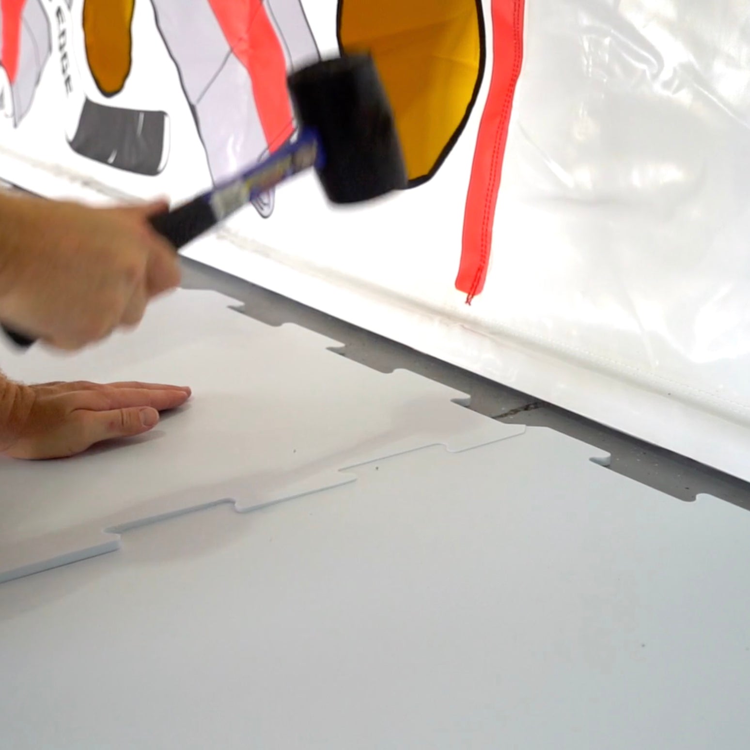 Installation of our skateable synthetic ice is a breeze. Each panel connects with just a few swings of the rubber mallet, so you'll be skating within minutes. Just make sure you have a hard, flat surface underneath. The seams are virtually non-existent after installation.